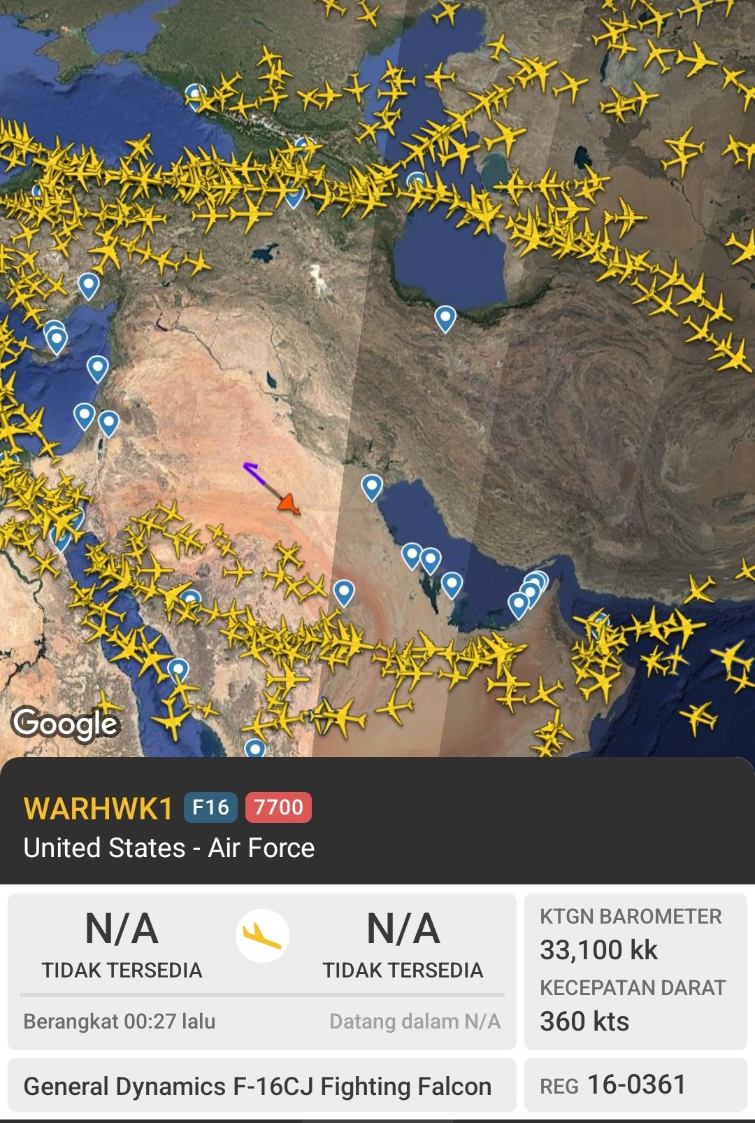 Pantauan pada peta lalu lintas udara menunjukkan wilayah tersebut dalam kondisi padat oleh penerbangan sipil. Sementara itu, jalur pesawat tempur tampak menyimpang dari rute normal, mengindikasikan adanya upaya pengalihan darurat (emergency diversion).