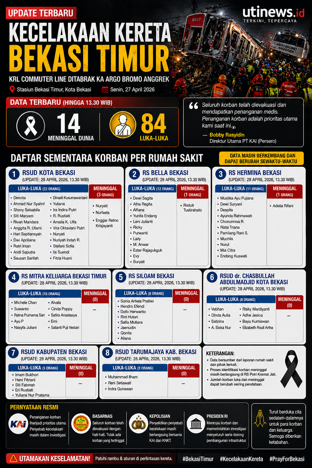 Utinews.id – Proses pendataan korban kecelakaan kereta di Stasiun Bekasi Timur terus diperbarui. Hingga Selasa (28/4/2026) siang, korban tercatat 14 orang meninggal dunia dan 84 orang luka-luka, dengan penanganan tersebar di sejumlah rumah sakit di Bekasi dan Jakarta.