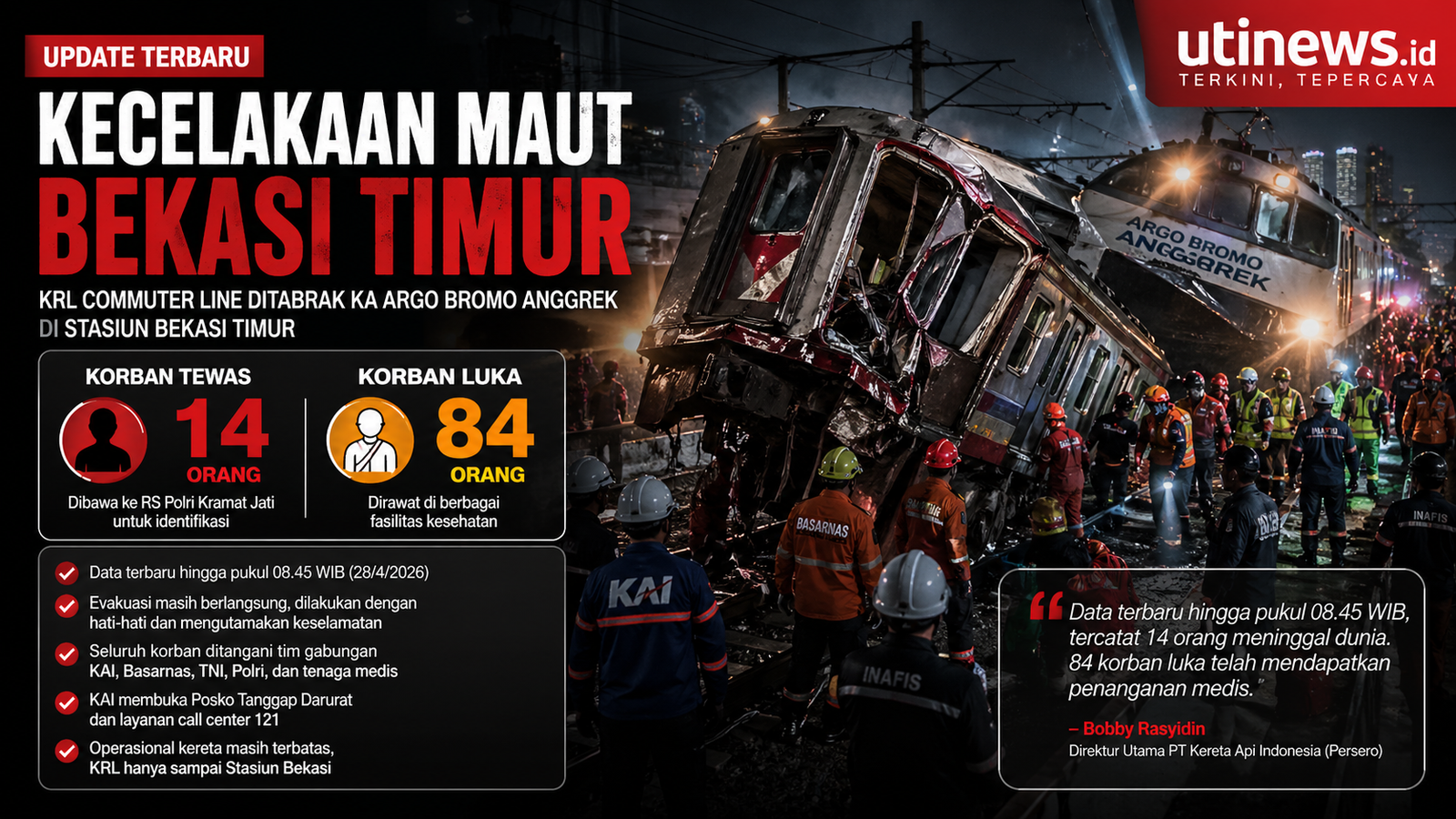 Utinews.id – Jumlah korban dalam kecelakaan kereta di Stasiun Bekasi Timur terus bertambah. Hingga Selasa (28/4/2026) pukul 08.45 WIB, korban meninggal dunia tercatat 14 orang, sementara 84 lainnya mengalami luka-luka dan tengah menjalani perawatan medis.